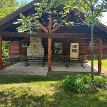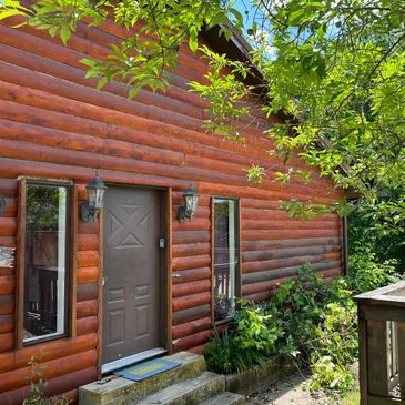 A double studio style two bathroom cabin with a large river view deck and front patio.