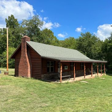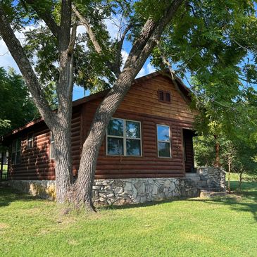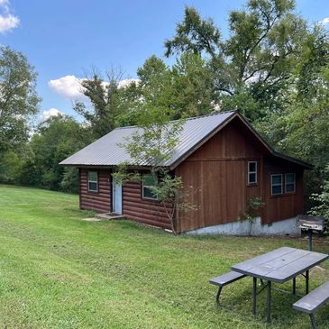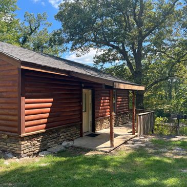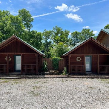 A two bedroom one bathroom cabin with a screened-in back porch.
